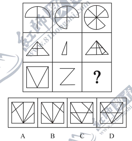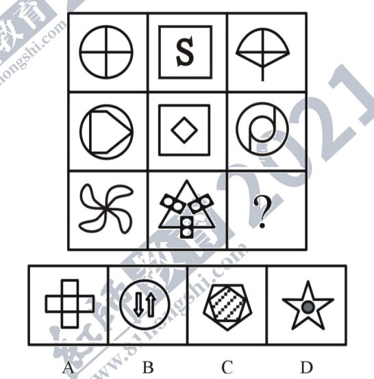 解析:組成元素凌亂,優(yōu)先考慮屬性或數(shù)量。圖形均出現(xiàn)了對稱的特征,優(yōu)先考慮對稱性。第一行三個圖形均是對稱圖形,繼續(xù)觀察圖 1 既軸對稱又中心對稱,圖 2 僅中心對稱,圖 3 僅軸對稱。第二行驗證規(guī)律,三個圖形也均是對稱圖形,第二行中圖 1 僅軸對稱,圖 2 既軸對稱又中心對稱,圖 3 僅中心對稱。所以,此題考查的是對稱性和遍歷的綜合考點。第三行運(yùn)用規(guī)律,第三行圖 1 僅中心對稱,圖2 僅軸對稱,問號處需要找一個圖形既是軸對稱圖形又是中心對稱圖形,只有 A 選項符合。因此,選擇 A 選項。