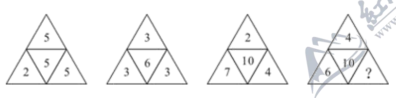 解析:觀察圖形中數(shù)字發(fā)現(xiàn) 5=2×5-5,6=3×3-3,10=7×2-4,規(guī)律為中間數(shù)字=左下角數(shù)字×上面數(shù)字-右下角數(shù)字,可得 10=6×4-所求項,則所求項為 24-10=14。