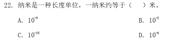 22.答案:A。解析:“納米(Nanometer,符號(hào):nm),即為毫微米,是長度的度量單位。1納米=10的負(fù)9次方米。1納米相當(dāng)于4倍原子大小,比單個(gè)細(xì)菌的長度還要小的多。故本題答案為A。