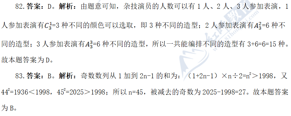 82. 三個(gè)爬桿雜技演員分別穿著紅、黃、藍(lán)三種顏色的演出服裝,如果只按照雜技演員的個(gè)數(shù)和演出服裝的顏色順序進(jìn)行編排,一共能編排( )種不同的造型。