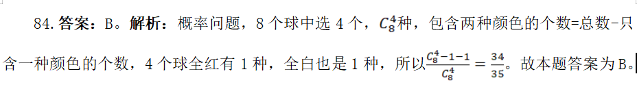 84. 從裝有4個(gè)紅球,4個(gè)白球的袋中任取4個(gè)球,則所取的4個(gè)球中包括兩種不同顏色的球的概率是( )。