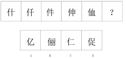 3.答案:D。解析:元素組成不同,且無明顯屬性規(guī)律,優(yōu)先考慮數(shù)量規(guī)律。觀察發(fā)現(xiàn),題干圖形均為漢字,考慮漢字的筆畫數(shù)。題干中漢字筆畫數(shù)分別為4、5、6、7、8,故?處應(yīng)選擇筆畫數(shù)為9的漢字,A項(xiàng)為3筆畫,B項(xiàng)為9筆畫,C項(xiàng)為4筆畫,D項(xiàng)為9筆畫,排除A、C項(xiàng)。比較B、D項(xiàng)發(fā)現(xiàn)部分?jǐn)?shù)不同,考慮部分?jǐn)?shù)。題干圖形部分?jǐn)?shù)均為2,故?處應(yīng)選擇兩部分的圖形,只有D項(xiàng)符合。故本題答案為D。