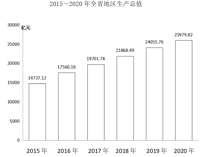 A. 與2015年相比,2020年全省地區(qū)生產總值翻了一番
