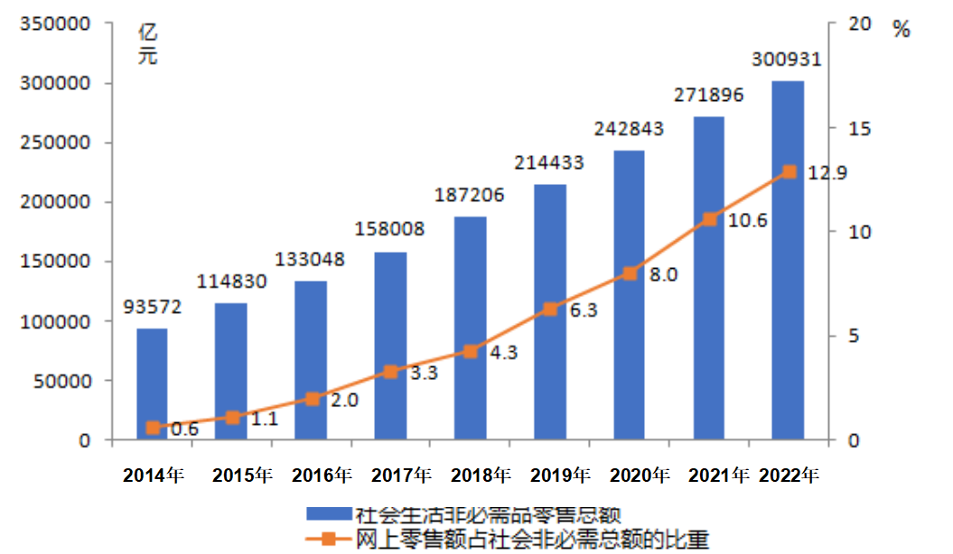 96. 與2014年相比,2022年網(wǎng)上社會生活非必需品零售總額約翻了( )番?