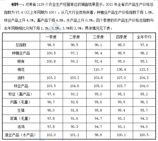 97.答案:A。解析:考點直接查找型。通過表格數(shù)據(jù)可知,油料價格持續(xù)升高,林業(yè)產(chǎn)品在第四季度下降,水產(chǎn)品在二、三季度下降,棉花在第一、二季度無數(shù)據(jù),故本題答案為A。