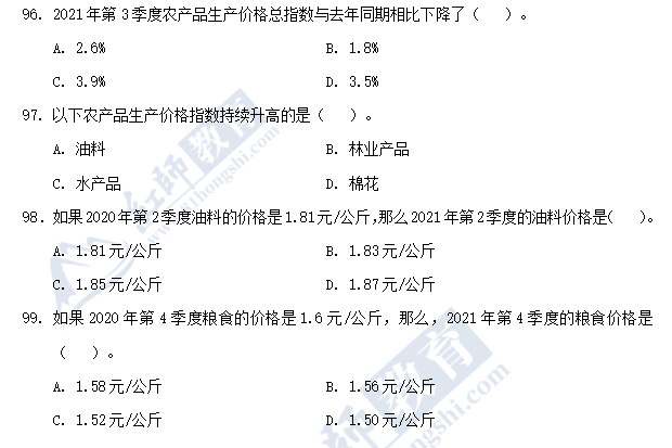 96.答案:C。解析:考點直接查找型。由文字資料得,第三季度農(nóng)產(chǎn)品生產(chǎn)價格總指數(shù)比去年同期相比下降了3.9%,故本題答案為C。