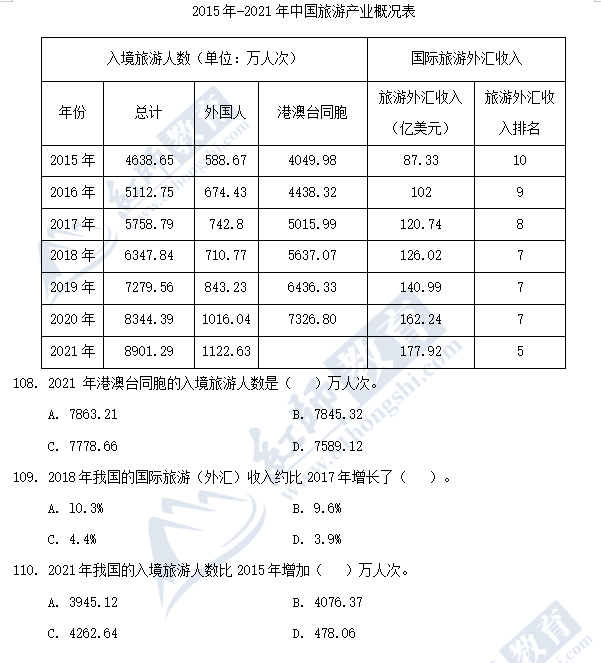 110.答案:C。解析:2021年我國的入境旅游人數(shù)比2015年增加了8901.29-4638.65,可直接用尾數(shù)法,故本題答案為C。