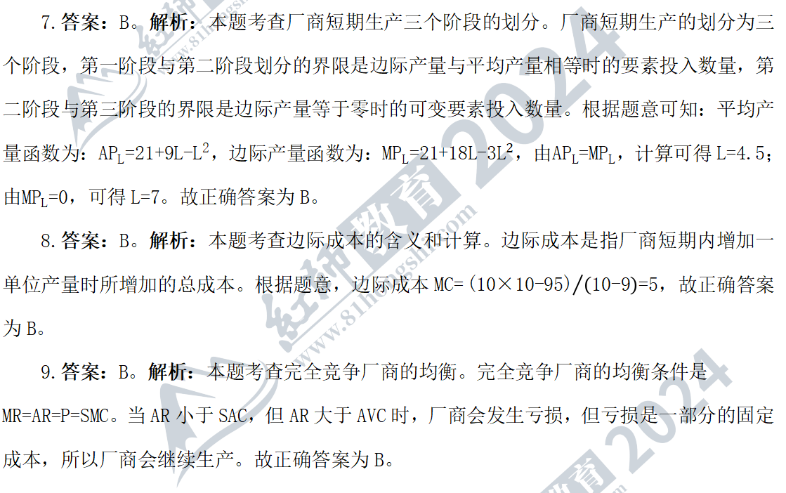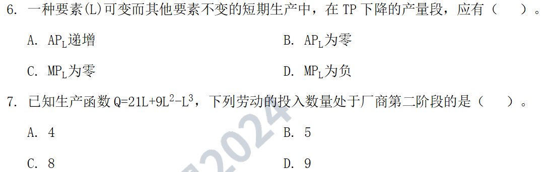 6.答案:D。解析:本題考查短期產(chǎn)量函數(shù)之間的關(guān)系。當(dāng)總產(chǎn)量下降時(shí),平均產(chǎn)量遞減,但是為正值,邊際產(chǎn)量遞減,為負(fù)值。綜上所述,正確答案為D。