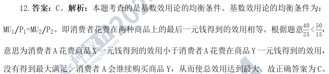 12. 若消費者A只準(zhǔn)備買兩種商品X和Y,X的價格為25,Y的價格為15。若A買了9個單位X和4個單位Y,所獲得的邊際效用值分別為40個單位和50個單位,則( )。
