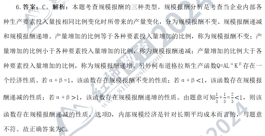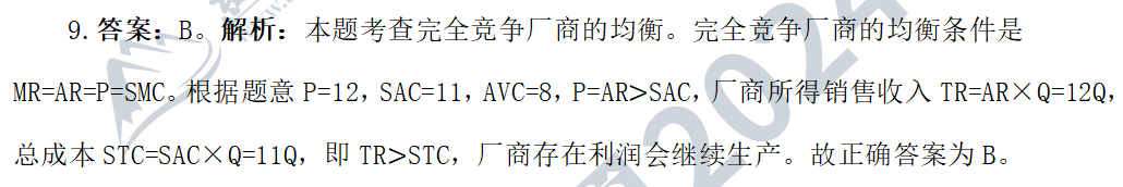 8.答案:C。解析:本題考查總成本曲線與短期成本曲線之間的關(guān)系。長(zhǎng)期總成本曲線是廠商在長(zhǎng)期中在每一產(chǎn)量水平上通過(guò)選擇最大的生產(chǎn)規(guī)模所能達(dá)到的最低總成本。從圖形上看,長(zhǎng)期總成本曲線是短期總成本曲線的包絡(luò)線,故選項(xiàng)A表述正確;長(zhǎng)期平均成本曲線是廠商在長(zhǎng)期內(nèi)按產(chǎn)量平均計(jì)算的最低總成本,從圖形上看,長(zhǎng)期平均成本是短期總成本曲線的包絡(luò)線,故選項(xiàng)B表述正確。長(zhǎng)期邊際成本是廠商在長(zhǎng)期內(nèi)增加一單位產(chǎn)量所引起的最低總成本的增量。在某一產(chǎn)量上,長(zhǎng)期邊際成本與短期邊際成本相等,故選項(xiàng)C表述錯(cuò)誤;在長(zhǎng)期生產(chǎn)過(guò)程中,廠商可以調(diào)整所有生產(chǎn)要素的投入數(shù)量,從而選擇最優(yōu)的生產(chǎn)規(guī)模,甚至進(jìn)入退出一個(gè)行業(yè),故選項(xiàng)D表述正確。故正確答案為C。