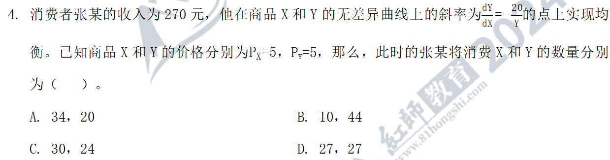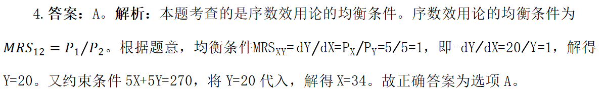 5.答案:D。解析:本題考查的是恩格爾曲線和恩格爾定律的含義。早在19世紀60年代,德國統(tǒng)計學家恩格爾對比比利時家庭調(diào)查數(shù)據(jù)分類列表,建立了在食品項目以及其他項目上的支出與家庭支出(或總支出)之間的數(shù)量關(guān)系。這些數(shù)量關(guān)系及其相應(yīng)的圖形被稱為恩格爾曲線。故選項AB的表述是正確的。假定商品的價格保持不變,則家庭用于某種商品的支出量與消費量具有完全相同的性質(zhì),因此,恩格爾曲線就可以有商品的消費數(shù)量與家庭收入之間的關(guān)系表示出來。經(jīng)過簡單的轉(zhuǎn)化,收入變動與商品消費數(shù)量變動的軌跡就可以由某種商品的消費數(shù)量隨著收入變動而變動的軌跡描繪出來,故選項C正確。恩格爾定律表示隨著家庭收入的增加,食物支出的增長速度不及收入同增長速度,故選項D的表述是錯誤的。故正確答案為選項D。
