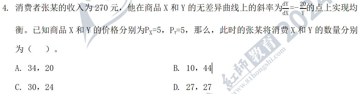 3.答案:B。解析:本題考查的是邊際消費傾向。每增加1單位可支配收入中用于消費部分所占的比例,叫做邊際消費傾向,本題中,收入增加8000-2000=6000元,消費增加6000-2000=4000元,邊際消費傾向MPC=ΔC/ΔY=4000/6000=2/3,所以B選項正確,其他選項數(shù)據(jù)都是錯誤的,選B。