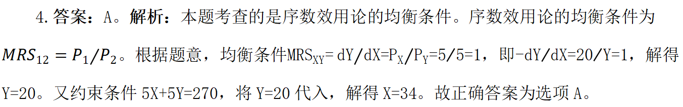 5.答案:D。解析:本題考查的是恩格爾曲線和恩格爾定律的含義。早在19世紀60年代,德國統(tǒng)計學家恩格爾對比比利時家庭調查數(shù)據(jù)分類列表,建立了在食品項目以及其他項目上的支出與家庭支出(或總支出)之間的數(shù)量關系。這些數(shù)量關系及其相應的圖形被稱為恩格爾曲線。故選項AB的表述是正確的。假定商品的價格保持不變,則家庭用于某種商品的支出量與消費量具有完全相同的性質,因此,恩格爾曲線就可以有商品的消費數(shù)量與家庭收入之間的關系表示出來。經過簡單的轉化,收入變動與商品消費數(shù)量變動的軌跡就可以由某種商品的消費數(shù)量隨著收入變動而變動的軌跡描繪出來,故選項C正確。恩格爾定律表示隨著家庭收入的增加,食物支出的增長速度不及收入同增長速度,故選項D的表述是錯誤的。故正確答案為選項D。