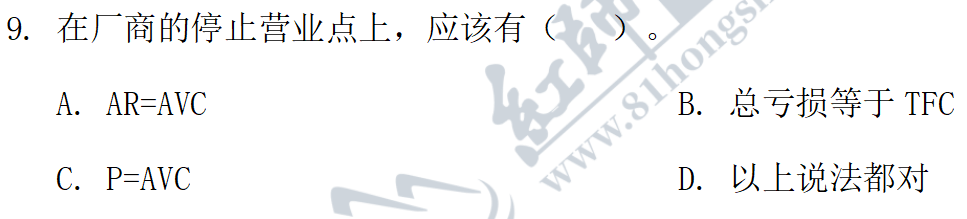 9.答案:D。解析:本題考查完全競爭廠商的短期均衡。當(dāng)廠商位于停產(chǎn)臨界點時,廠商的需求曲線剛好與AVC曲線的最低點相切,即P=AR=AVC,意味著廠商生產(chǎn)與不生產(chǎn)的結(jié)果是一樣的,虧損了全部的固定成本。選項ABC都是正確的。故正確答案為D。