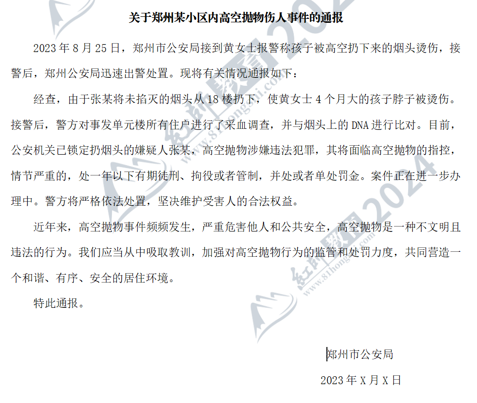 在現(xiàn)代都市生活中,隨著樓房日漸拔高,高空拋物的危害也越發(fā)凸顯。今年8月25日,河南鄭州一小區(qū)內(nèi),黃女士推著嬰兒車在樓下散步,路過電梯廳附近斜坡時(shí),一根未滅的煙頭從天而降,導(dǎo)致四個(gè)月大的孩子脖子被燙傷。孩子一直哭泣,并且燙傷部位化膿感染,還伴有發(fā)燒的癥狀。小區(qū)內(nèi)裝有監(jiān)控,但只能覆蓋一樓區(qū)域。事發(fā)后,黃女士曾找到物業(yè),但沒有得到解決。于是黃女士在社交平臺(tái)求助。此事爆出后,輿論嘩然,引發(fā)了社會(huì)公眾的廣泛關(guān)注。后來,黃女士向鄭州市公安局報(bào)警,民警立即出動(dòng)并對(duì)樓棟集體采血驗(yàn)證DNA,目前警方已鎖定扔煙頭的嫌疑人張某,扔煙頭的是住在18樓的男子。