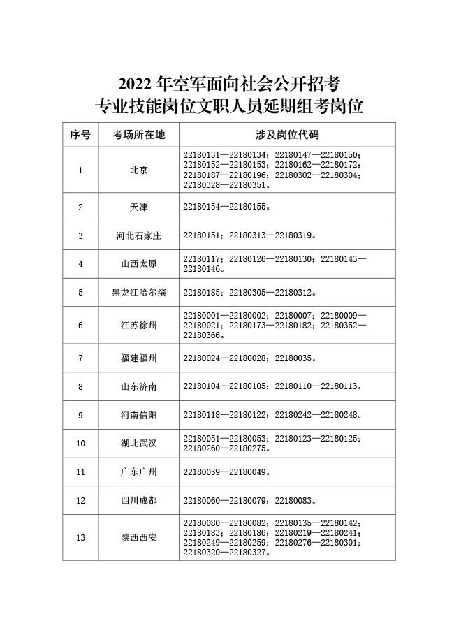 原文標(biāo)題:關(guān)于延期組織北京等考區(qū)2022年空軍面向社會(huì)公開(kāi)招考專(zhuān)業(yè)技能崗位文職人員統(tǒng)一考試的公告