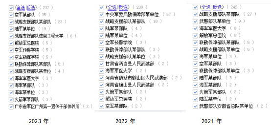 其中戰(zhàn)略支援部隊(duì)某部隊(duì),數(shù)量比較穩(wěn)定,保持在20—30個(gè)。空軍某部隊(duì)和陸軍某單位在2021年和2022年時(shí)招錄人數(shù)很少,而在2023年時(shí)招錄數(shù)量到了20-30個(gè)。