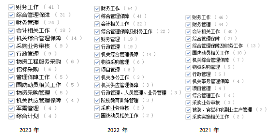 2021—2023年軍隊(duì)文職資料中,工商管理類專業(yè)所從事的工作主要是財(cái)務(wù)工作、綜合管理保障、會(huì)計(jì)相關(guān)工作、財(cái)務(wù)管理、機(jī)關(guān)綜合管理保障等。