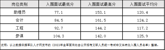 從筆試進(jìn)面平均分來看,2021年進(jìn)面平均分較高,在125—130左右,22年和23年平均分基本上相持平,在120分左右。