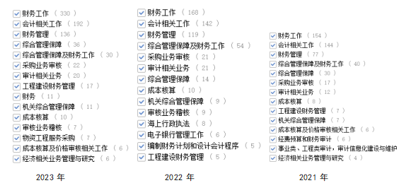 以上是2021—2023年軍隊文職崗位計劃中,標明的會計學專業(yè)從事的工作,主要有財務工作、會計相關工作、財務管理、綜合管理保障、綜合管理保障及財務工作、采購業(yè)務審核、審計相關業(yè)務、機關綜合管理保障、工程建設財務管理、成本核算等。