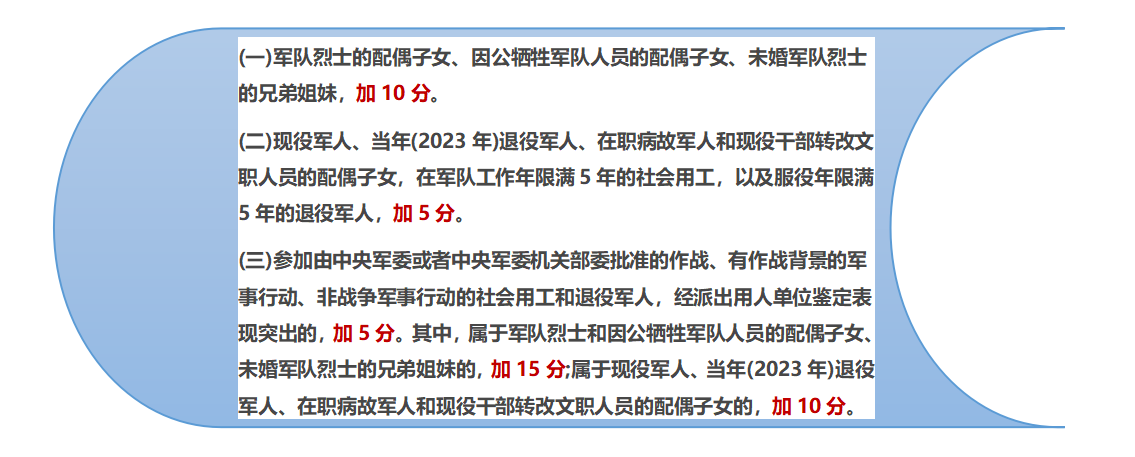 ”軍隊(duì)烈士和因公犧牲軍隊(duì)人員的配偶子女、未婚軍隊(duì)烈士的兄弟姐妹,現(xiàn)役軍人、2023年退役軍人、在職病故軍人和現(xiàn)役干部轉(zhuǎn)改文職人員的配偶子女,在軍隊(duì)工作年限滿5年的社會(huì)用工、服役年限滿5年的退役軍人,以及參加由中央軍委或者中央軍委機(jī)關(guān)部委批準(zhǔn)的作戰(zhàn)、有作戰(zhàn)背景的軍事行動(dòng)、非戰(zhàn)爭(zhēng)軍事行動(dòng)的社會(huì)用工和退役軍人,通過(guò)報(bào)名資格條件審核且取得全軍統(tǒng)一筆試有效成績(jī)的,享受公共科目加分優(yōu)待政策。“