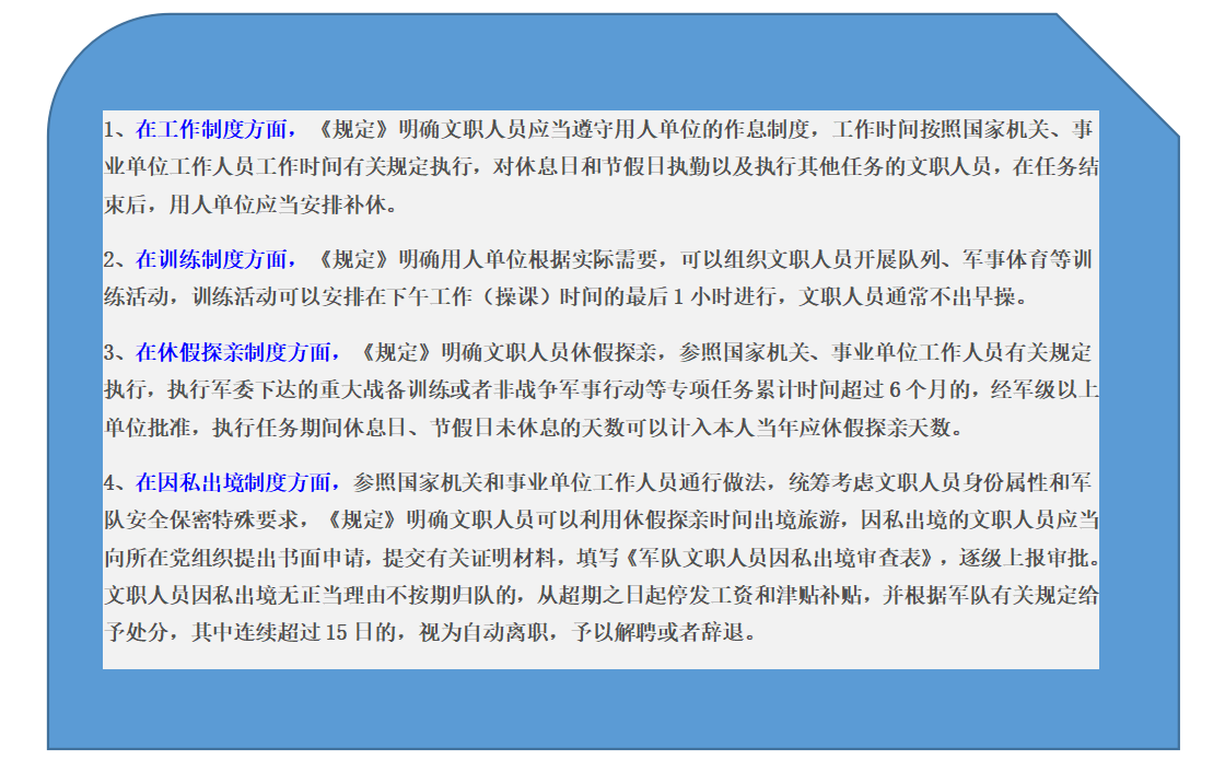 根據(jù)軍隊(duì)特殊要求和文職人員身份特點(diǎn),對涉及文職人員切身利益的具體事項(xiàng)進(jìn)行了科學(xué)合理、更為人性化的規(guī)范。