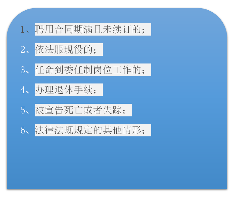 小編還要特別提示:聘用合同期滿且不再續(xù)訂的文職人員,如果正在參加重大軍事行動、承擔(dān)國家和軍隊重大任務(wù)等,應(yīng)當(dāng)在相關(guān)任務(wù)結(jié)束時終止聘用合同;文職人員出現(xiàn)患病或者負(fù)傷且在規(guī)定的醫(yī)療期內(nèi),女性文職人員在孕期、產(chǎn)期、哺乳期內(nèi)等情形的,聘用合同應(yīng)當(dāng)續(xù)延至相應(yīng)情形消失時終止。