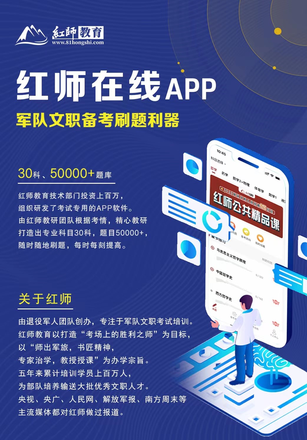 紅師教育由退役軍人創(chuàng)辦,專門從事文職的招考培訓(xùn)。他們秉承“身正為紅、學(xué)高為師”的校訓(xùn),以軍事文化的厚重和軍事化管理的嚴(yán)格,對希望邁入軍營、成為軍隊文職人員的莘莘學(xué)子提供一對一的服務(wù)。搭建文職考試培訓(xùn)網(wǎng)站。聘請軍隊院校專家教授和地方師資。精心錄制公共科目和專業(yè)科目視頻課程投放于紅師官網(wǎng)。研發(fā)題庫,每門學(xué)科均有對應(yīng)的練習(xí)題庫,配備了刷題APP。