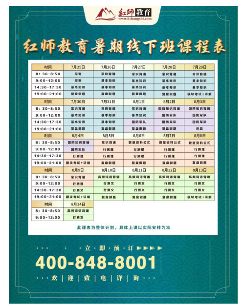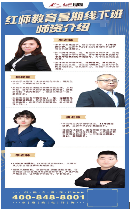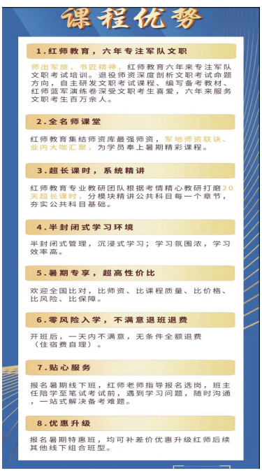 紅師教育由退役軍人創(chuàng)辦,專門從事文職的招考培訓。他們秉承“身正為紅、學高為師”的校訓,以軍事文化的厚重和軍事化管理的嚴格,對希望邁入軍營、成為軍隊文職人員的莘莘學子提供一對一的服務(wù)。已經(jīng)幫助諸多學子上岸軍隊文職。