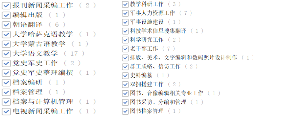 可以看到,漢語言文學(xué)專業(yè)與咱們之前分析的管理學(xué)專業(yè)較為相似,大多數(shù)考生在干事、參謀、高教或助理等崗位上就職,其中干事崗位占到了一個(gè)很大的比例,這與干事崗位特點(diǎn)密切相關(guān)。干事主要是在政治機(jī)關(guān)內(nèi)部設(shè)置,負(fù)責(zé)組織、黨建、宣傳、干部、保衛(wèi)、秘書等工作。比如秘書類更多是負(fù)責(zé)與群聯(lián)相關(guān)或者軍民融合等政治方面內(nèi)容,這與漢語言文學(xué)專業(yè)的學(xué)習(xí)內(nèi)容相契合。