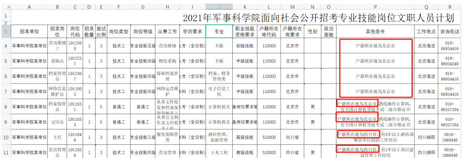以2021年軍事科學(xué)院發(fā)布的軍隊文職專業(yè)技能崗招聘公告為具體例子,對招聘的8名技能崗文職人員均做出了戶籍的要求。如下圖: