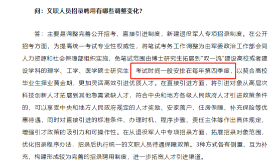 答:考試時間一般安排在每年第四季度,以契合高校畢業(yè)生擇業(yè)黃金期,更加靈活高效引進優(yōu)質(zhì)人才。