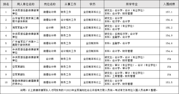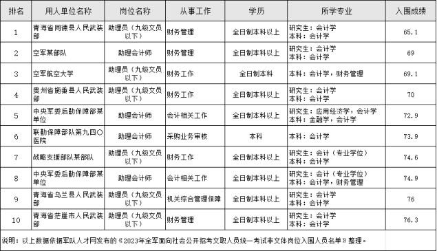 小編統(tǒng)計(jì)了了2023年會(huì)計(jì)學(xué)專業(yè)對(duì)應(yīng)典型崗位:筆試進(jìn)面分?jǐn)?shù)最高和最低的十大崗位,同學(xué)們可以參考一下。