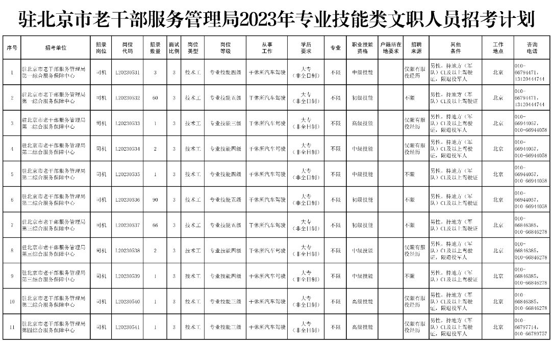 根據(jù)《中國人民解放軍文職人員條例》及有關(guān)政策規(guī)定,駐北京市老干部服務(wù)管理局2023年面向社會公開招考18個崗位、351名專業(yè)技能崗位文職人員。