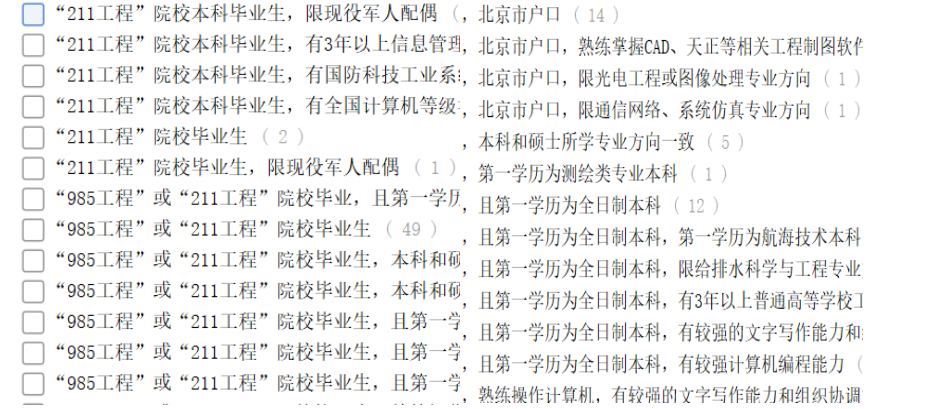 依據(jù)上圖不難發(fā)現(xiàn),除了有性別要求外,此科目的考生在身份還有頗多的限制,如對學(xué)校門檻和專業(yè)技能等在很多崗位都做了要求。這就說明此科目考生需要具備較強的專業(yè)知識和專業(yè)技能,以應(yīng)對軍隊文職中工作。