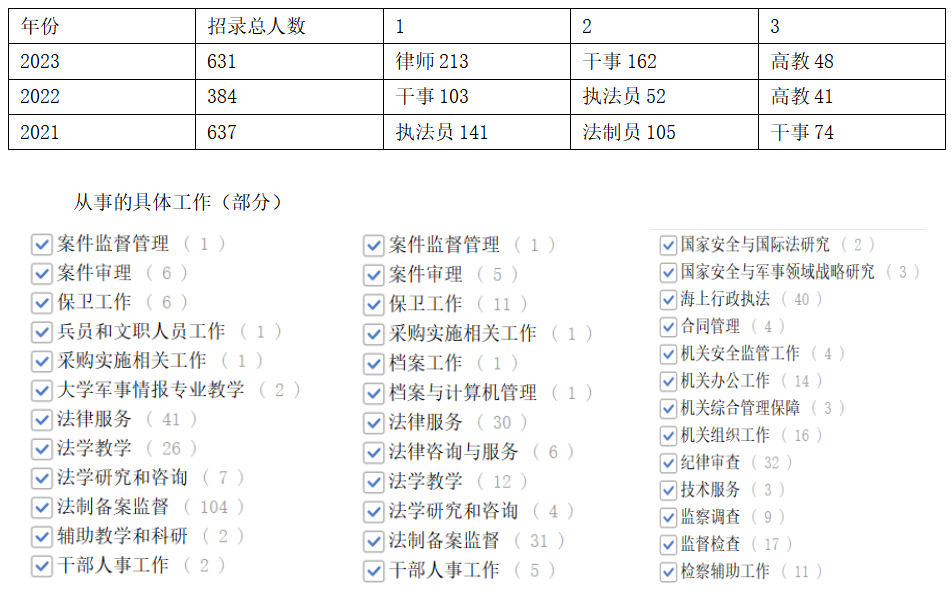 下面是2021年到2023年學習法學科目被招錄的考生從事單位數(shù)前三表: