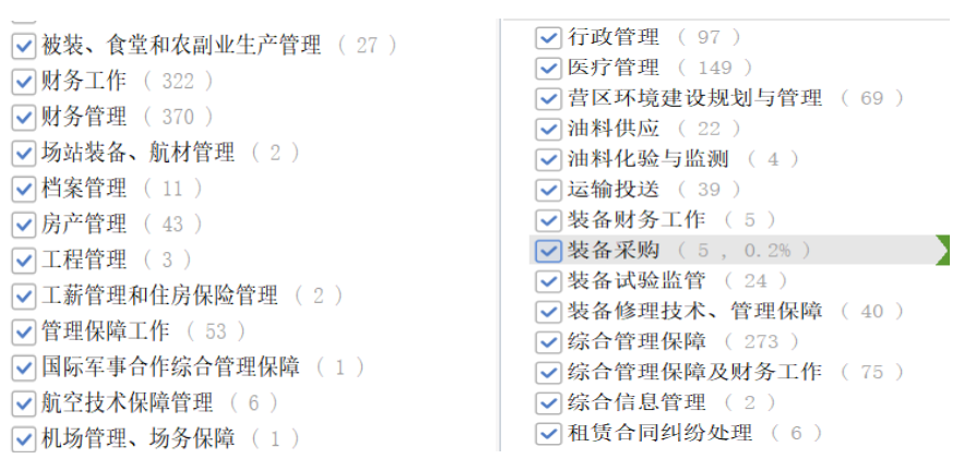 助理員從事的具體工作覆蓋面廣,相同崗位在不同的用人單位具有明顯的差異性。其中從事財務(wù)管理、財務(wù)工作、行政管理、房產(chǎn)管理、綜合管理保障的占主要多數(shù)。其次是機關(guān)綜合管理保障、土木工程專業(yè)工作。再次是營區(qū)環(huán)境建設(shè)規(guī)劃與管理、機關(guān)事務(wù)管理保障、供應(yīng)管理保障、檔案管理、軍事設(shè)施建設(shè)、運輸投送、被裝、食堂和農(nóng)副業(yè)生產(chǎn)管理、醫(yī)療管理、物資工程服務(wù)采購、裝備財務(wù)工作、勞動合同和工資薪酬管理、計算機和網(wǎng)絡(luò)安全保密、裝備采購、裝備修理技術(shù)和管理保障等占據(jù)較小部分。