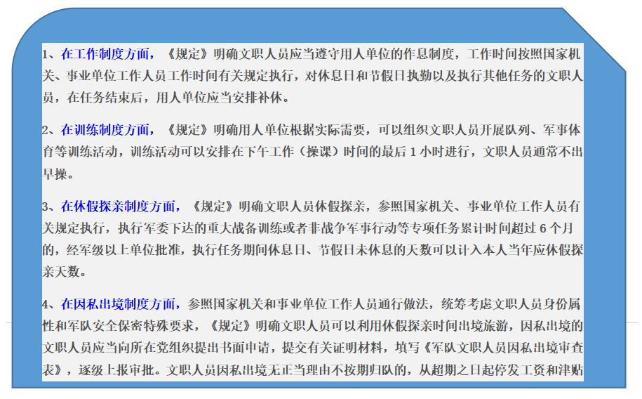 根據(jù)軍隊(duì)特殊要求和文職人員身份特點(diǎn),對涉及文職人員切身利益的具體事項(xiàng)進(jìn)行了科學(xué)合理、更為人性化的規(guī)范。