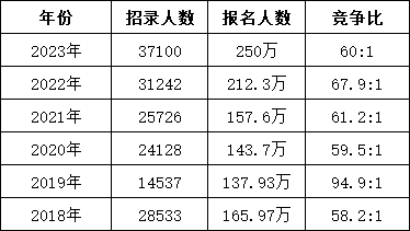 2023國(guó)考共計(jì)招錄37100人,比去年增加了5858人,漲幅高達(dá)報(bào)名人數(shù)也達(dá)到了史無前例的超250萬人。