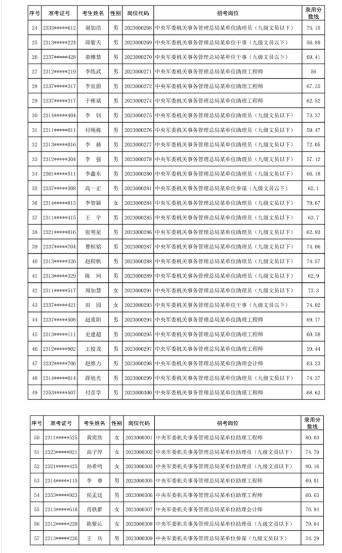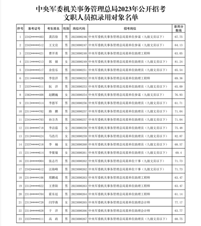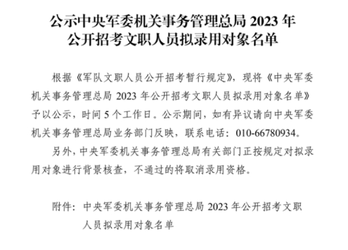 原文標題:公示中央軍委機關事務管理總局2023年公開招考文職人員擬錄用對象名單