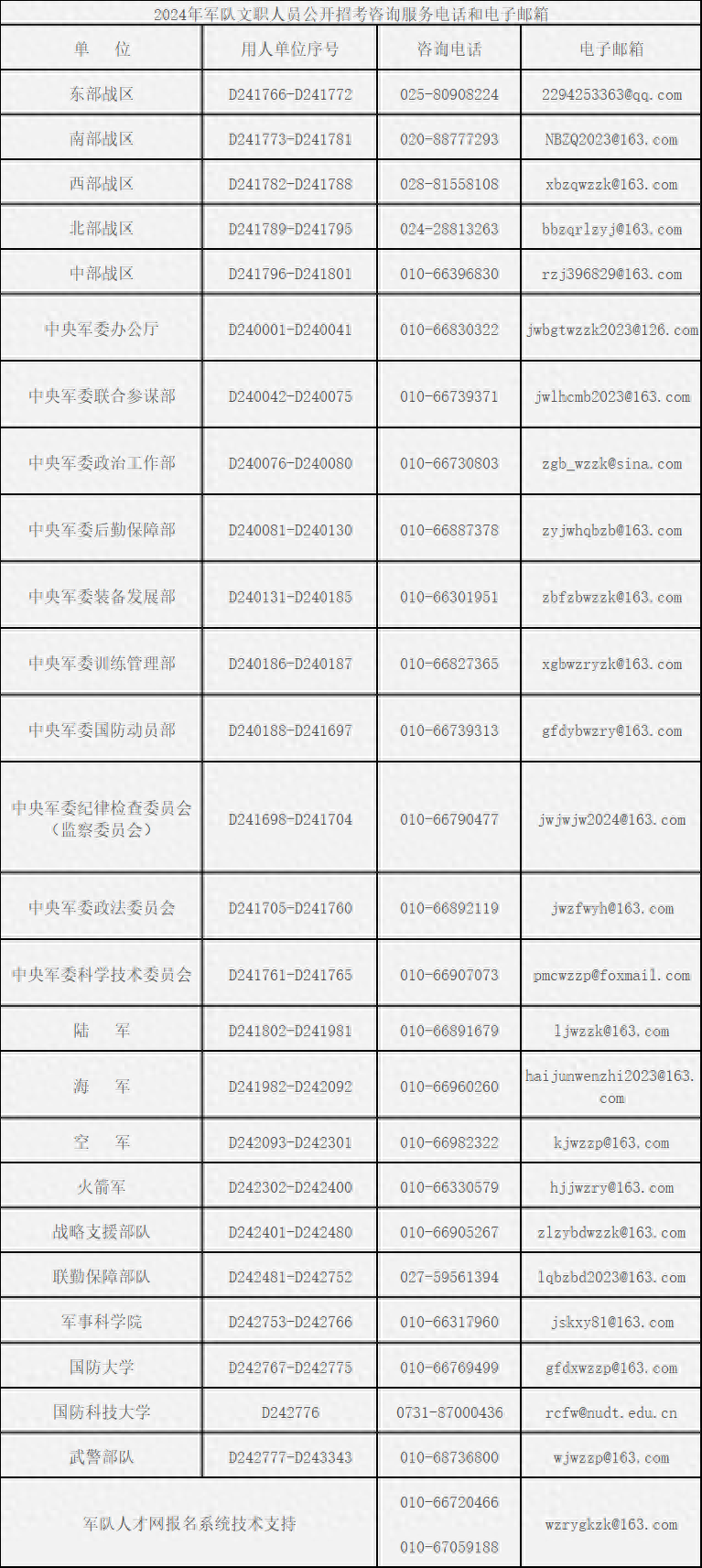 2024年軍隊(duì)文職人員公開招考咨詢服務(wù)電話和電子郵箱