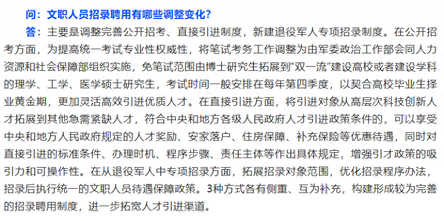 1月6日,“中國民兵”微信公眾號發(fā)布的《答記者問》中講到文職人員的招錄聘用有所有變化:“在公開招考方面,為提高統(tǒng)一考試專業(yè)性權(quán)威性,將筆試考務(wù)工作調(diào)整為由軍委政治工作部會同人力資源和社會保障部組織實施,免筆試范圍由博士研究生拓展到“雙一流”建設(shè)高?;蛘呓ㄔO(shè)學(xué)科的理學(xué)、工學(xué)、醫(yī)學(xué)碩士研究生,考試時間一般安排在每年第四季度,以契合高校畢業(yè)生擇業(yè)黃金期,更加靈活高效引進優(yōu)質(zhì)人才。”