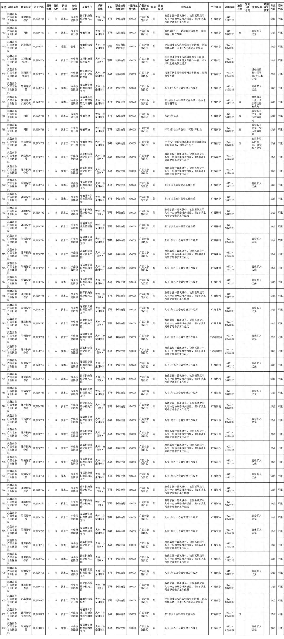 5月12日,軍隊人才網(wǎng)發(fā)布2023年武警部隊面向社會公開招聘專業(yè)技能類文職人員公告。公告顯示計劃招聘武警部隊專業(yè)技能類文職人員1824名,其中招聘工作地點位于廣西的53名。