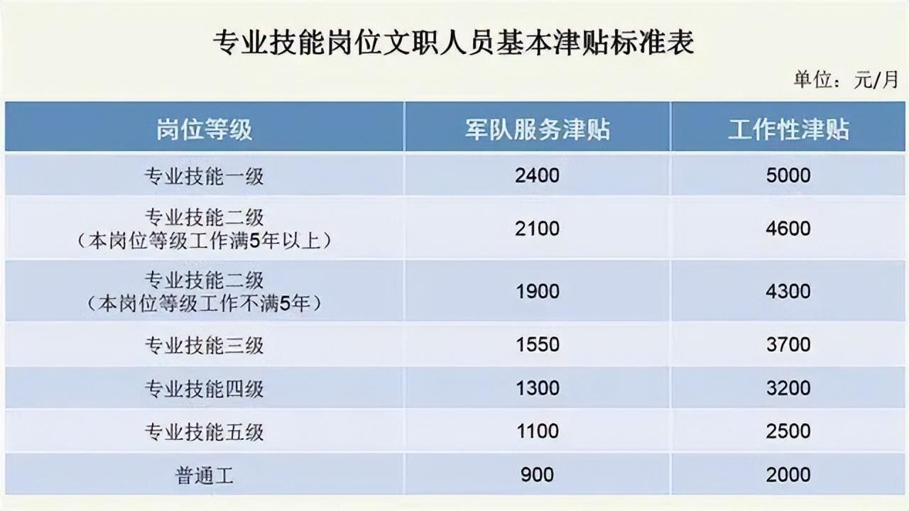 專業(yè)技能崗位文職人員實(shí)行全軍統(tǒng)一的工資制度。工資由基本工資、基本津貼補(bǔ)貼、特殊津貼補(bǔ)貼和獎(jiǎng)勵(lì)工資等組成。