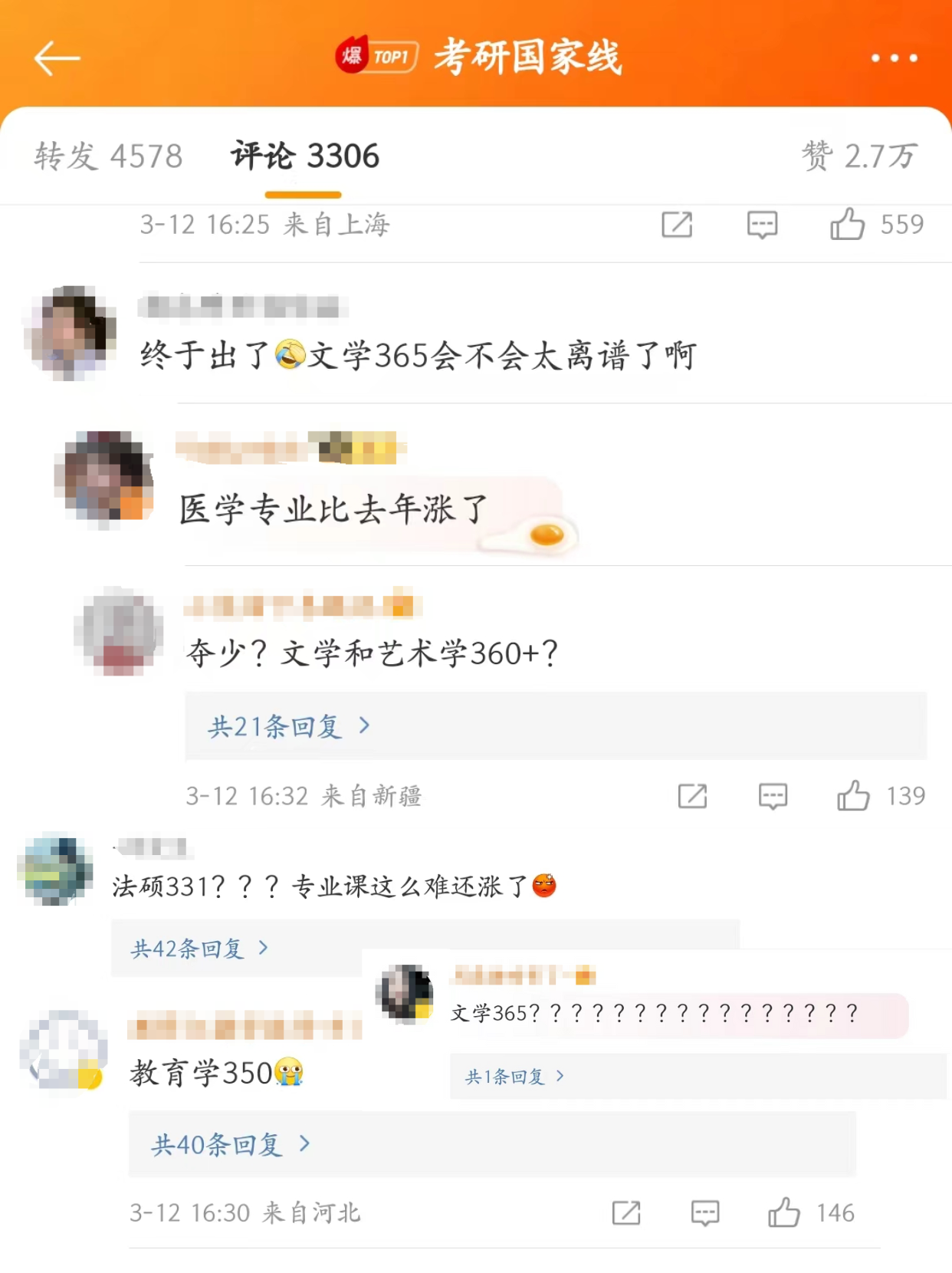 今天下午,2024年考研國家線出了,一經發(fā)布,便直接沖上熱搜,經各位考生的反響來看,眾多專業(yè)的國家分數線漲了。小編摘了幾條評論如下: