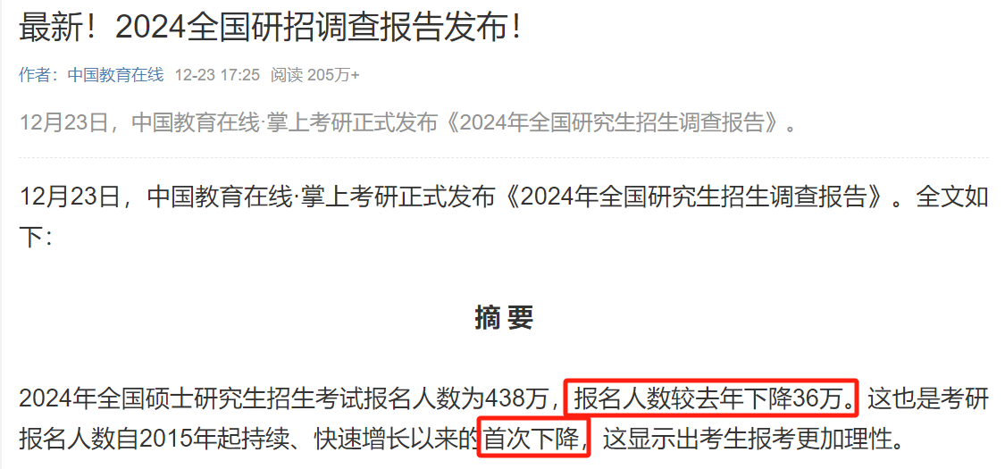 從2023年中國教育在線發(fā)布的《2024年全國研究生招生調查報告》中可知:今年的研究生報考人數相較去年呈現下降趨勢,減少了36萬,“考研熱”現象開始呈現降溫趨勢。