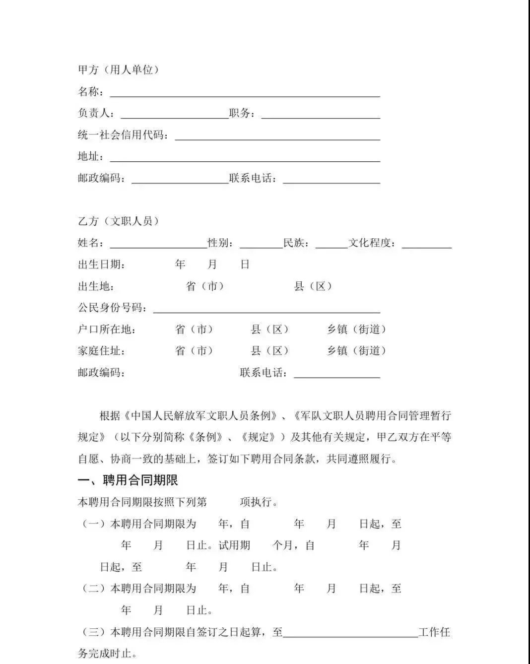 合同中的用人單位是指編制文職人員且具有統(tǒng)一社會信用代碼的軍隊團級以上建制單位。