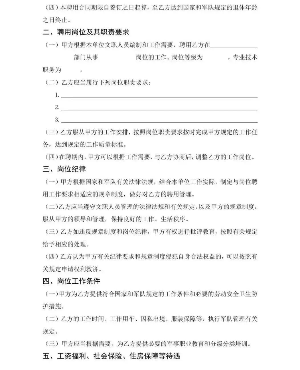 2.對實行聘用制的文職人員,自軍隊批準(zhǔn)招錄聘用之日起30日內(nèi),用人單位應(yīng)當(dāng)與其訂立書面聘用合同。