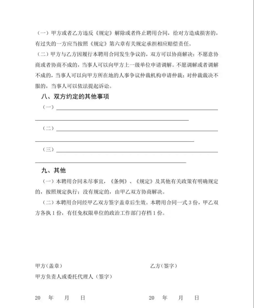 文職人員聘用合同文本式樣,由軍委政治工作部制定,并根據(jù)需要適時作出修訂。聘用合同文本一式3份,分別由用人單位和文職人員各執(zhí)1份,有任免權(quán)限單位的政治工作部門存檔1份。