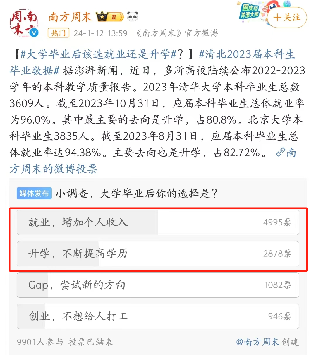 根據(jù)南方周末的一項調(diào)查結(jié)果顯示,就業(yè)和升學(xué)是參與者更傾向的選擇,并且就業(yè)要占比更大。
